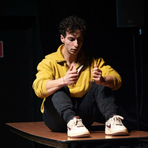 Au cœur de la salle de classe, un jeune homme se lève et s’adresse à ceux qui deviennent ses camarades le temps de la représentation, il va leur raconter son histoire.